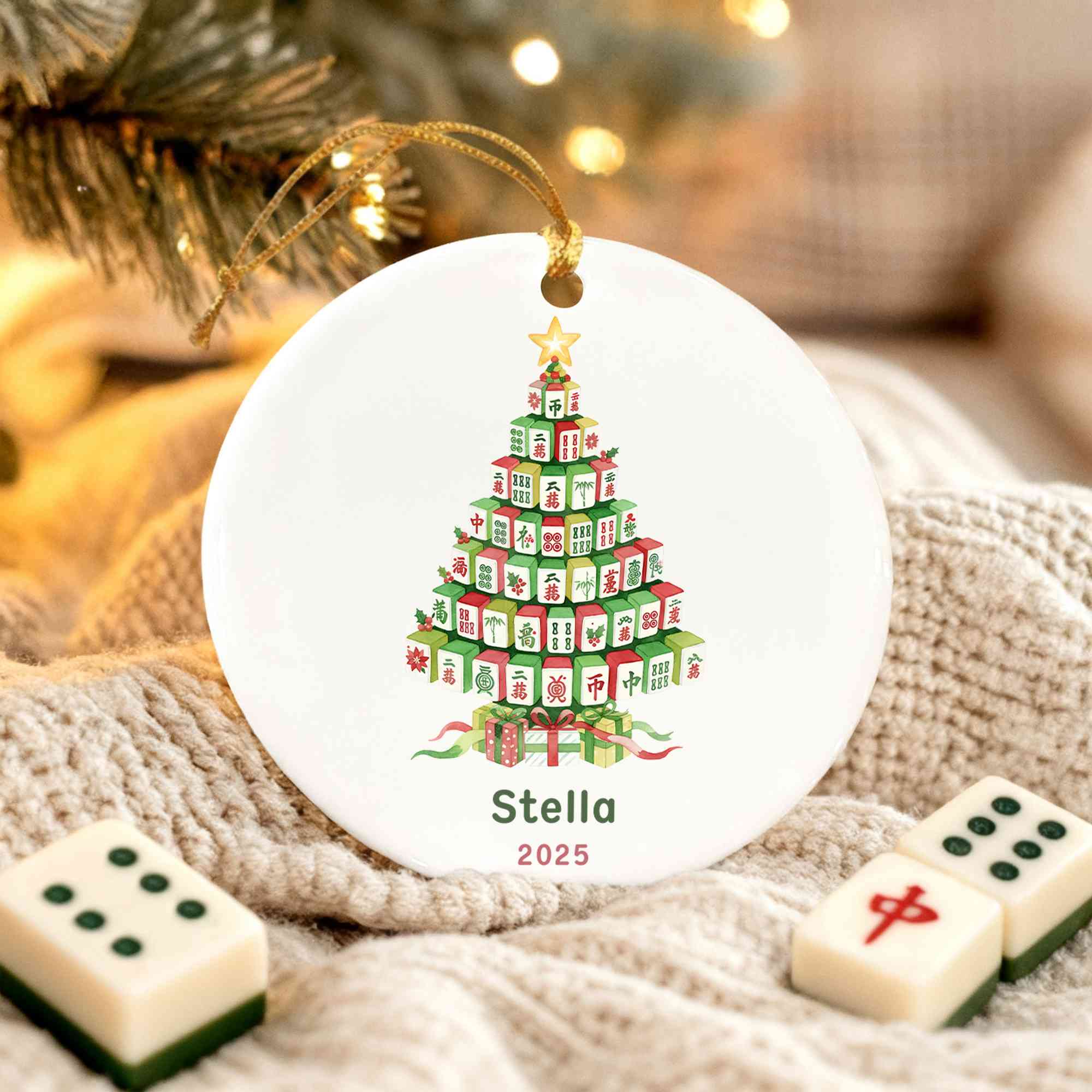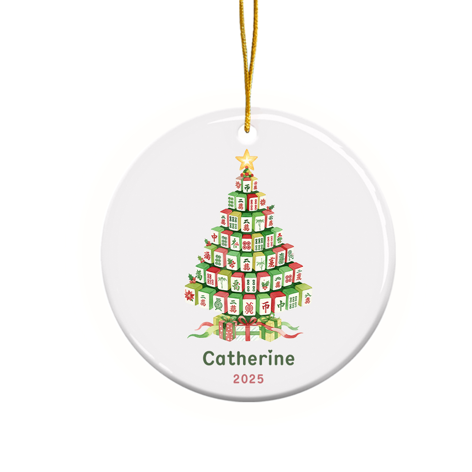 Elegant Mahjong Design - This charming Christmas ornament features a round ceramic design inspired by the timeless Mahjong game, beautifully crafted with intricate tiles forming a Christmas tree. The circle shape symbolizes unity and joy, bringing a special touch of culture and fun to your holiday tree.